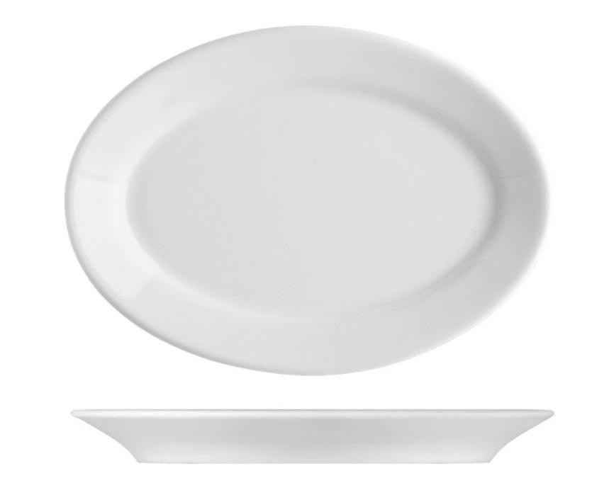 Biely oválny tanier alebo podnos v jednoduchom designu. Odolný silnostenný porcelán do domácností i gastro podnikov.