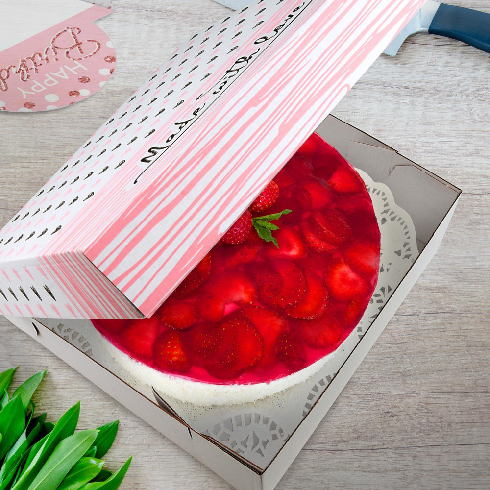 Krabica na tortu (mikrovlnitá lepenka) biela s potlačou 28 x 28 x 10 cm [100 ks]