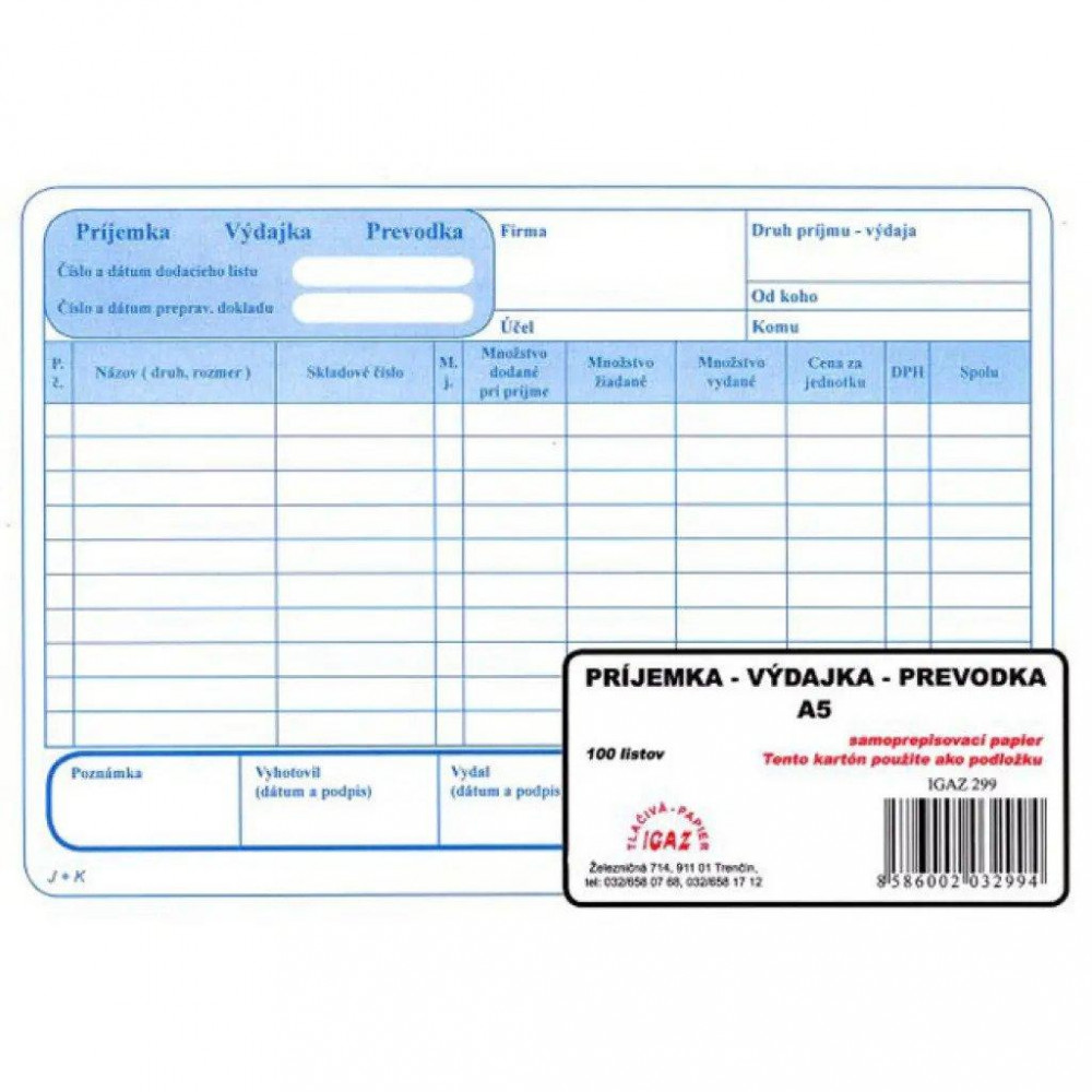 Obchodné tlačivo. Príjemka - výdajka - prevodka s DPH, samoprepis, A5, blok, 100 listov.